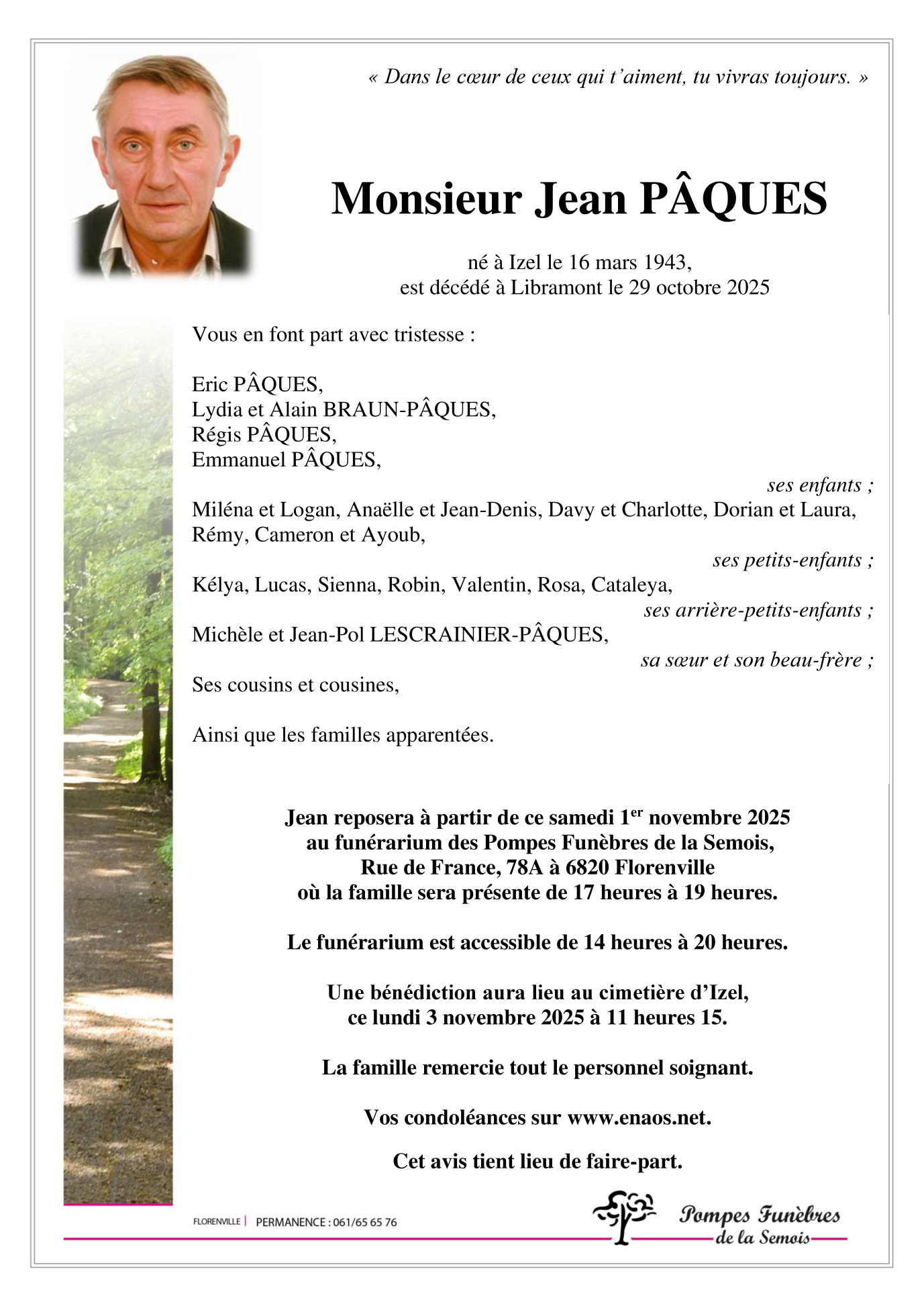 Né à Izel (6810) le mardi 16 mars 1943