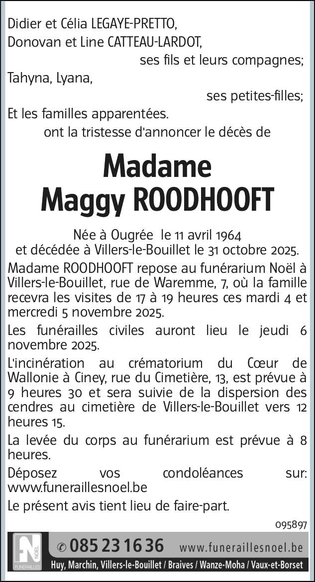 Décédée à Villers-le-Bouillet (4530) le vendredi 31 octobre 2025 à l'âge de 61 ans
