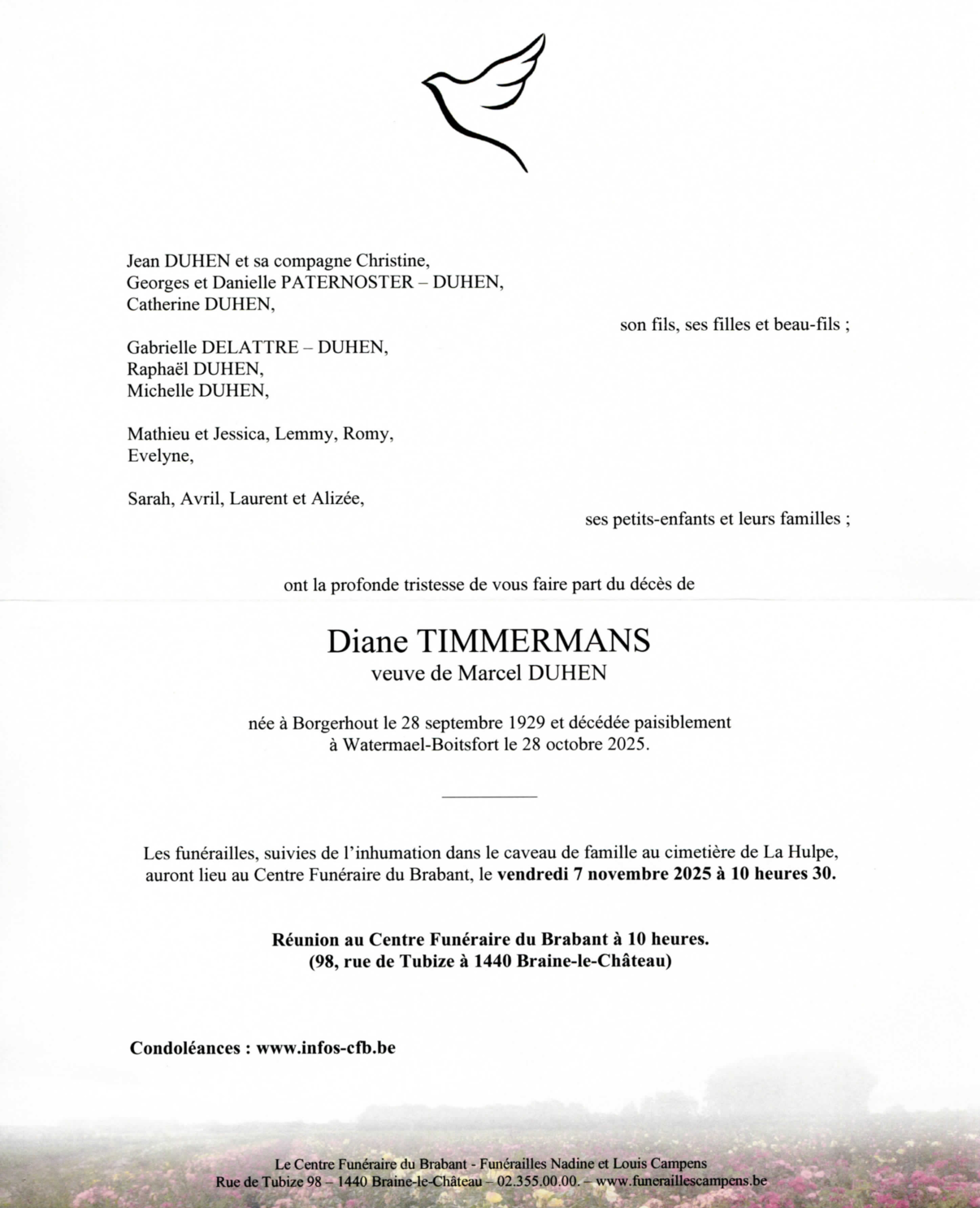 Décédée à Watermael-Boitsfort (1170) le mardi 28 octobre 2025 à l'âge de 96 ans