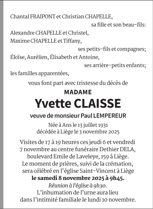Décédée à Liège (4020) le lundi 3 novembre 2025 à l'âge de 94 ans