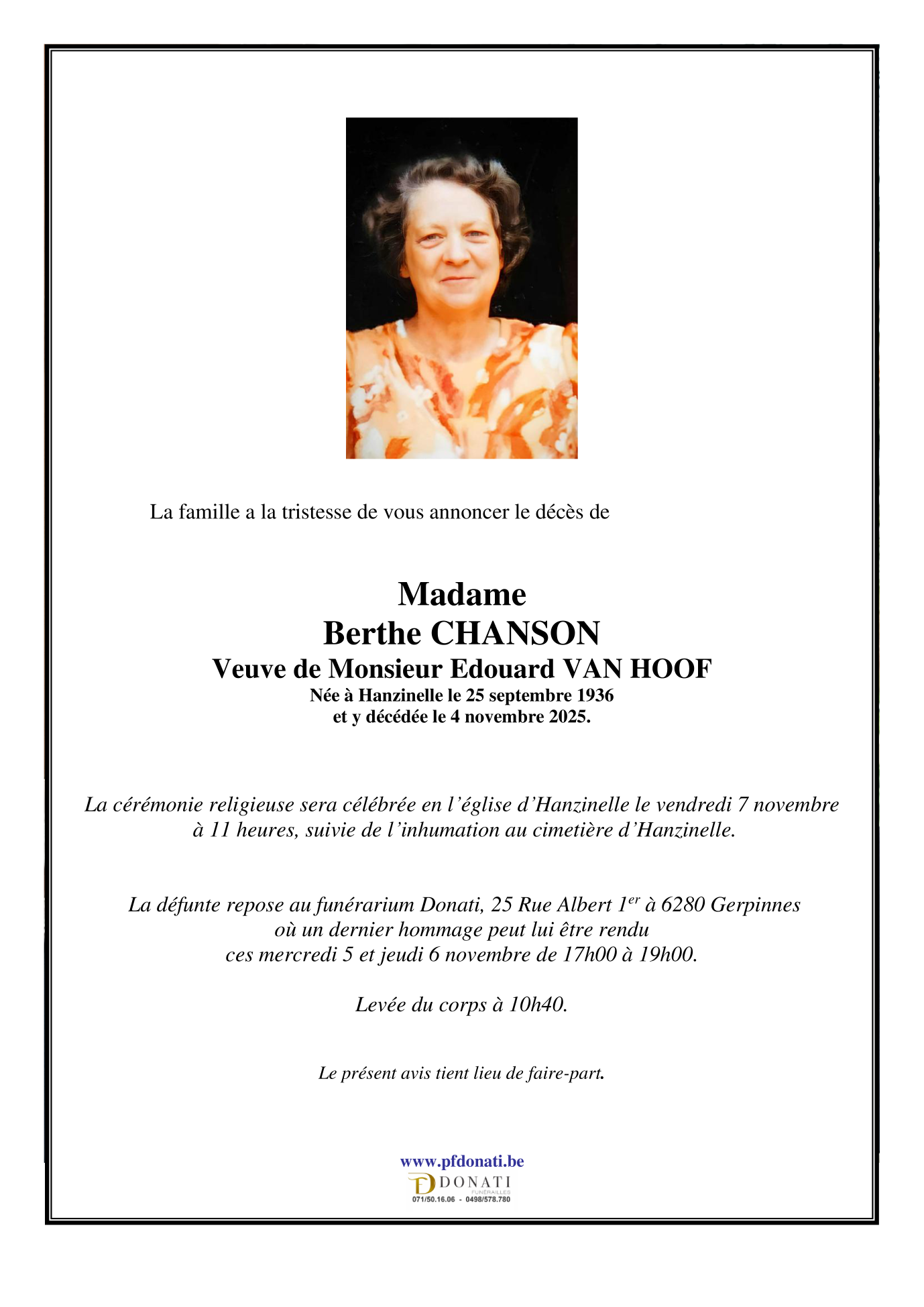 Fallecida en Hanzinelle (5621) el martes, 4 de noviembre de 2025 a la edad de 89 años