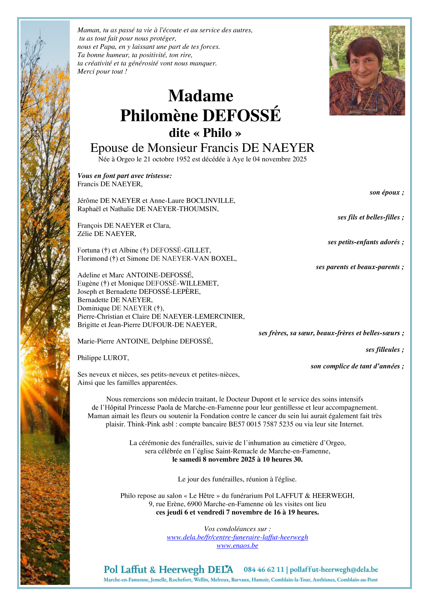 Décédée à Aye (6900) le mardi 4 novembre 2025 à l'âge de 73 ans
