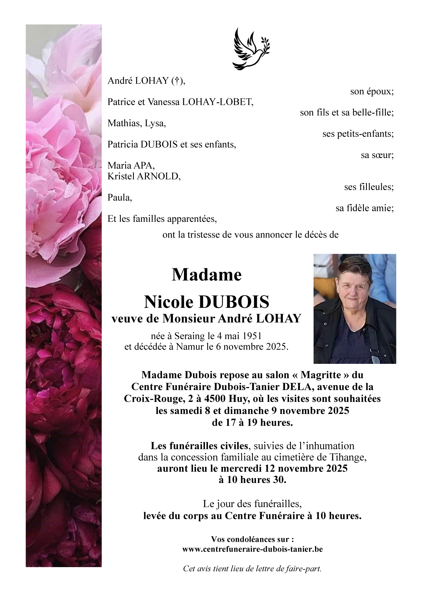 Décédée à Namur (5000) le jeudi 6 novembre 2025 à l'âge de 74 ans