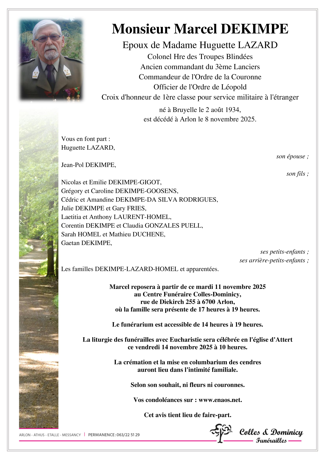 Décédé à Arlon (6700) le samedi 8 novembre 2025 à l'âge de 91 ans