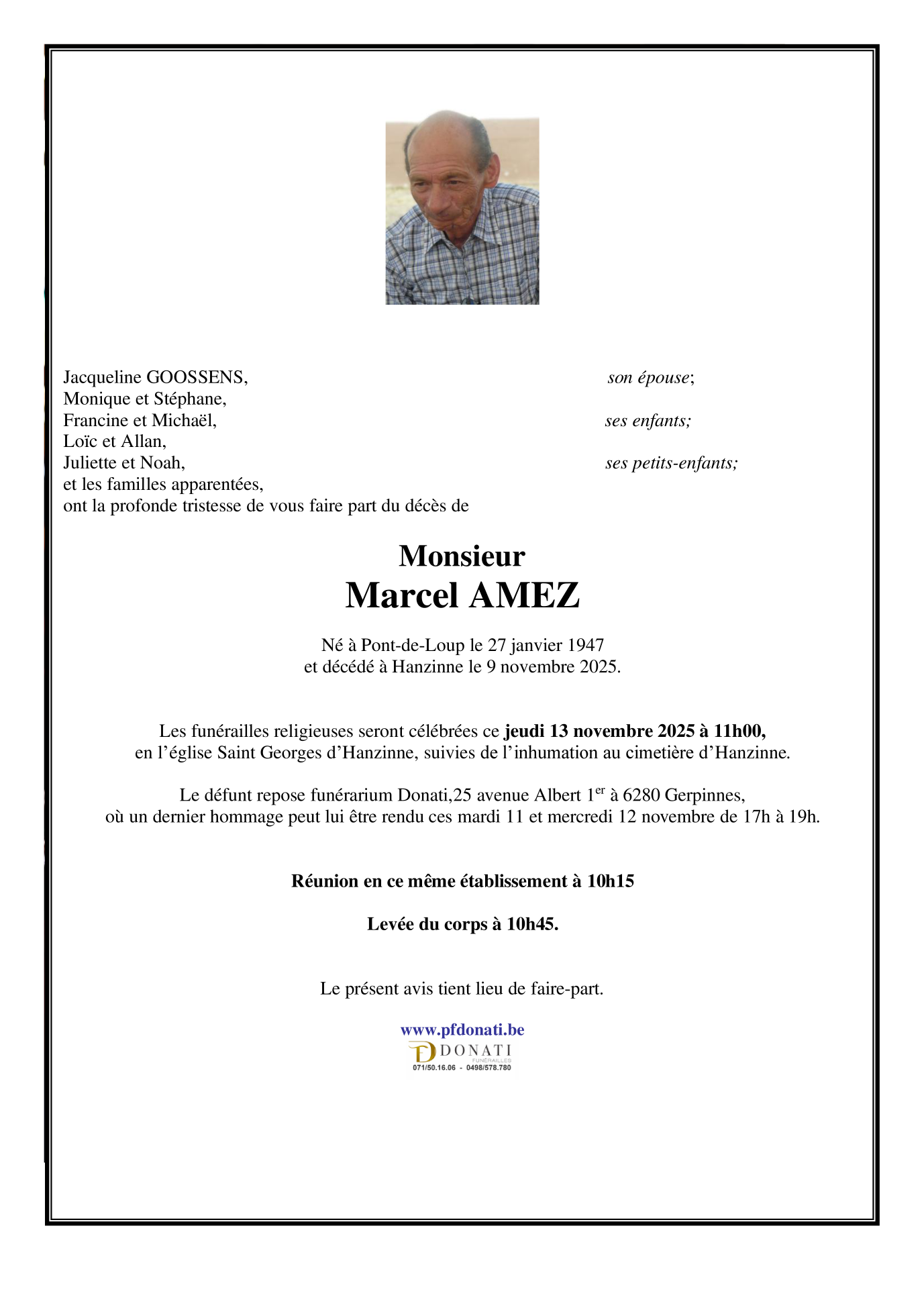 Décédé à Hanzinne (5621) le dimanche 9 novembre 2025 à l'âge de 78 ans