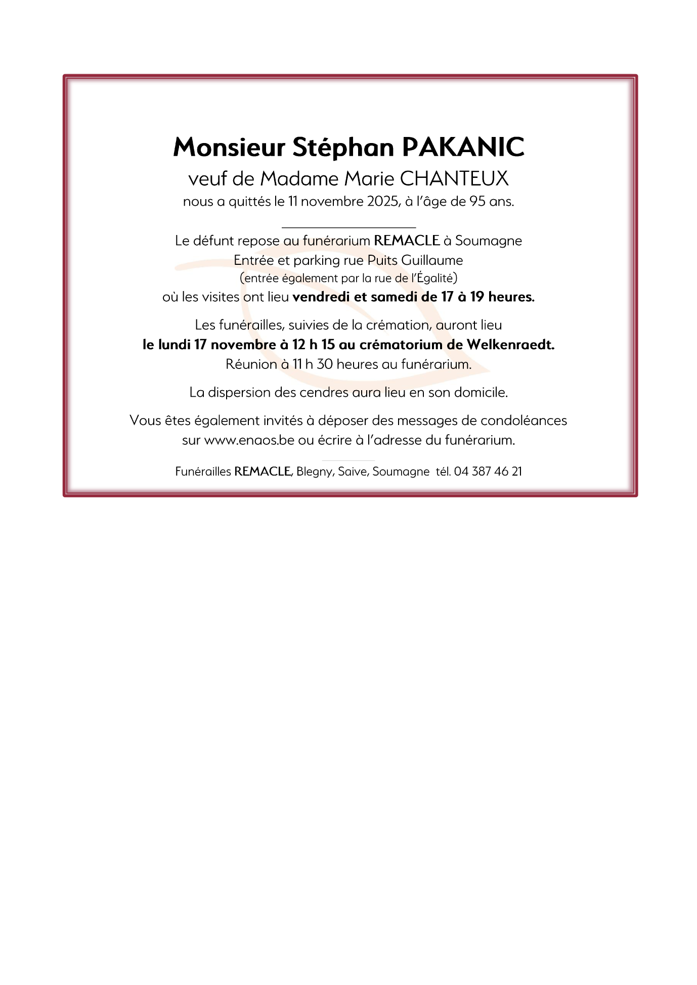 Décédé à Soumagne (4630) le mardi 11 novembre 2025 à l'âge de 95 ans
