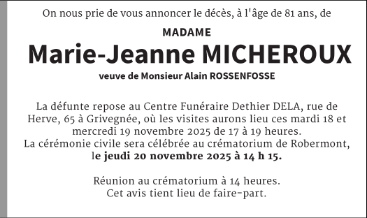 Décédée à Grivegnée (4030) le mercredi 12 novembre 2025 à l'âge de 81 ans