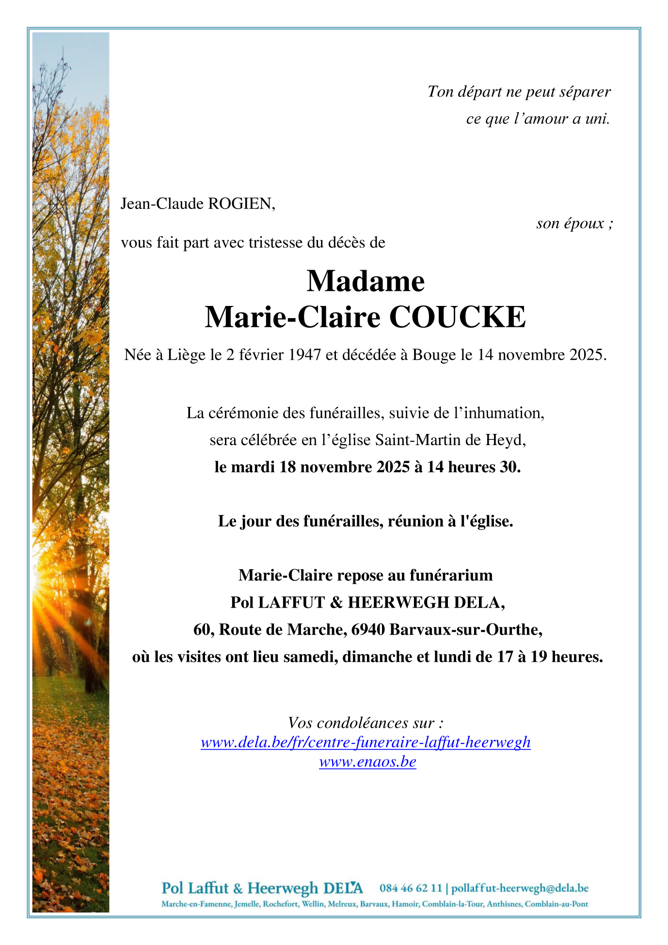 Décédée à Bouge (5004) le vendredi 14 novembre 2025 à l'âge de 78 ans