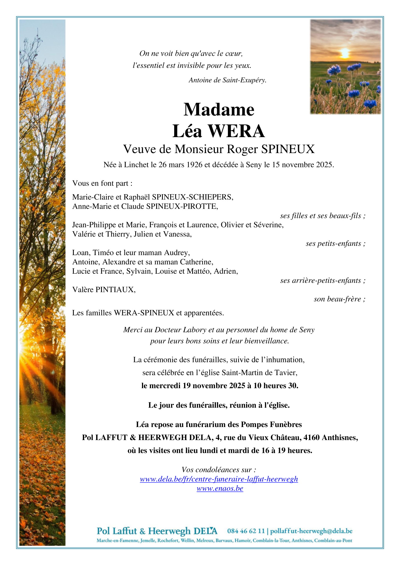 Décédée à Seny (4557) le samedi 15 novembre 2025 à l'âge de 99 ans