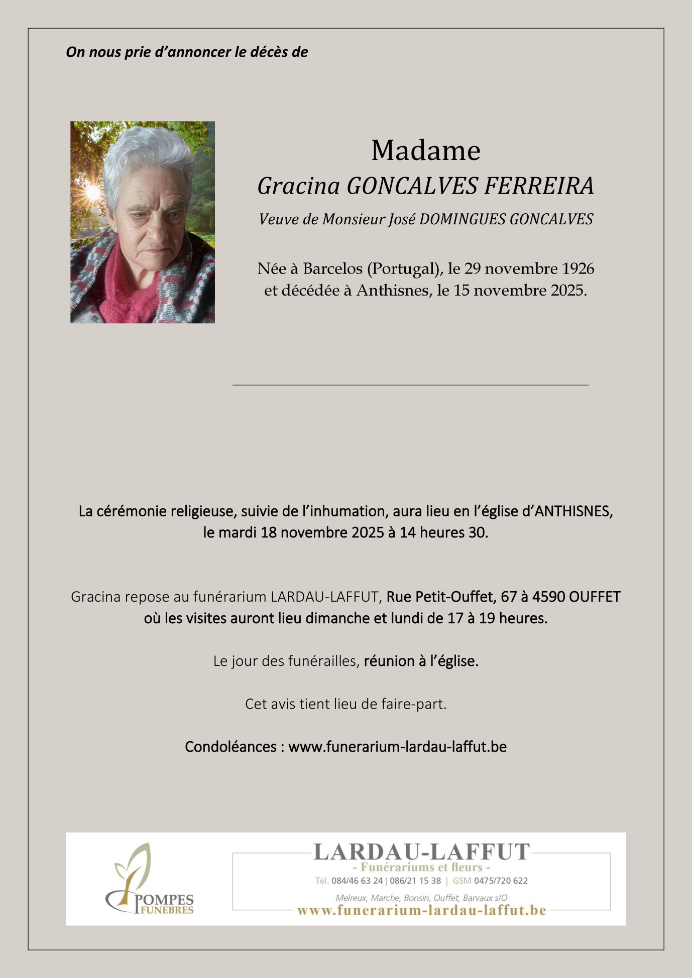 Veuve de Monsieur José DOMINGUES GONCALVES