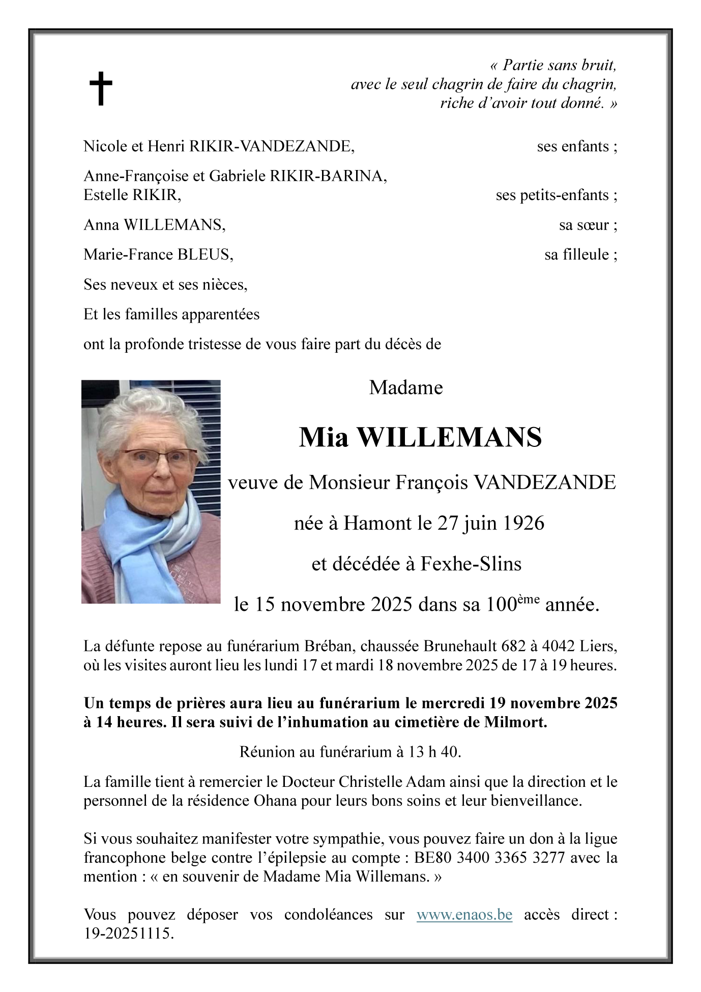 Madame Mia WILLEMANS veuve de François VANDEZANDE
