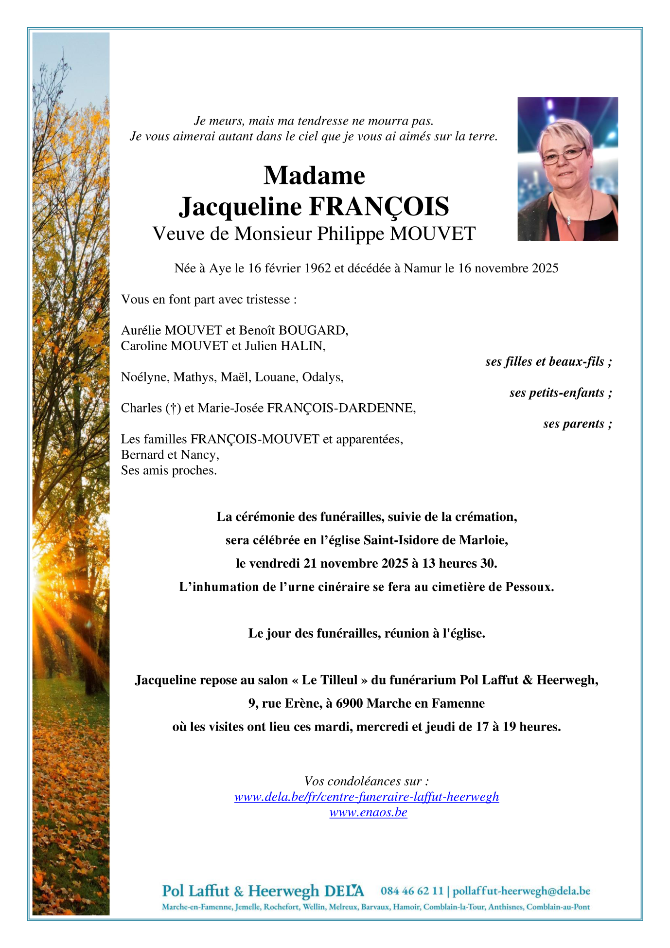 Décédée à Namur (5000) le dimanche 16 novembre 2025 à l'âge de 63 ans