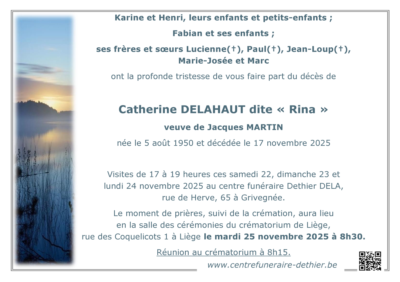 Décédée à Aywaille (4920) le lundi 17 novembre 2025 à l'âge de 75 ans