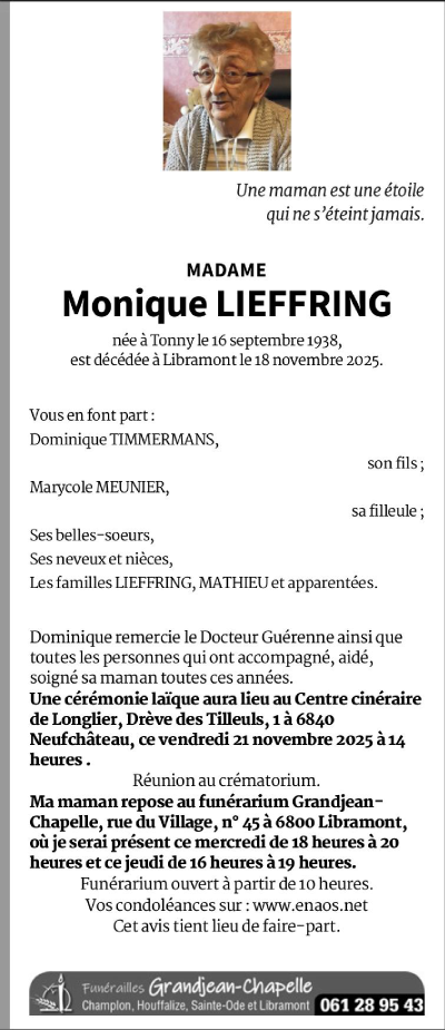 Décédée à Libramont (6800) le mardi 18 novembre 2025 à l'âge de 87 ans
