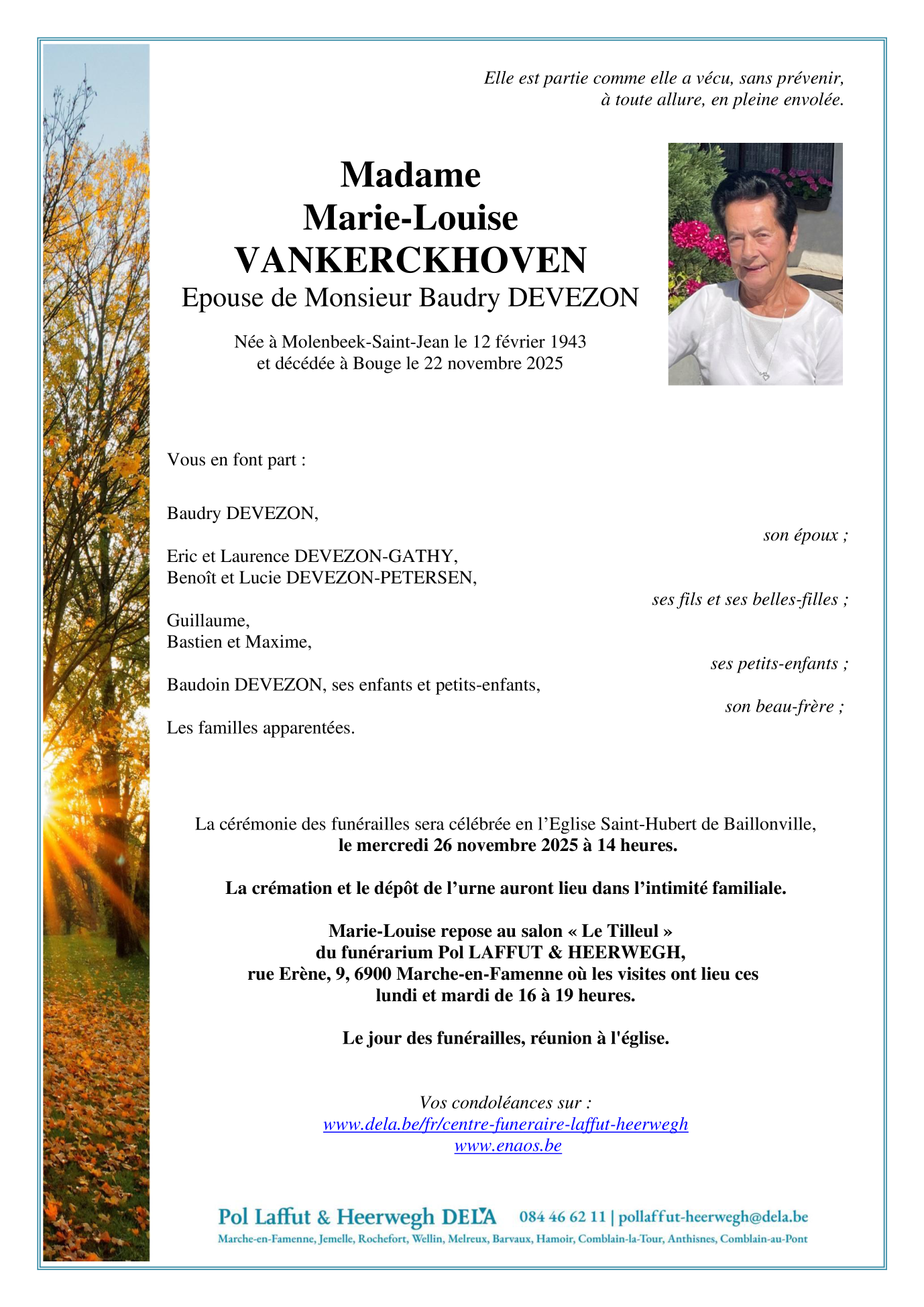 Décédée à Bouge (5004) le samedi 22 novembre 2025 à l'âge de 82 ans