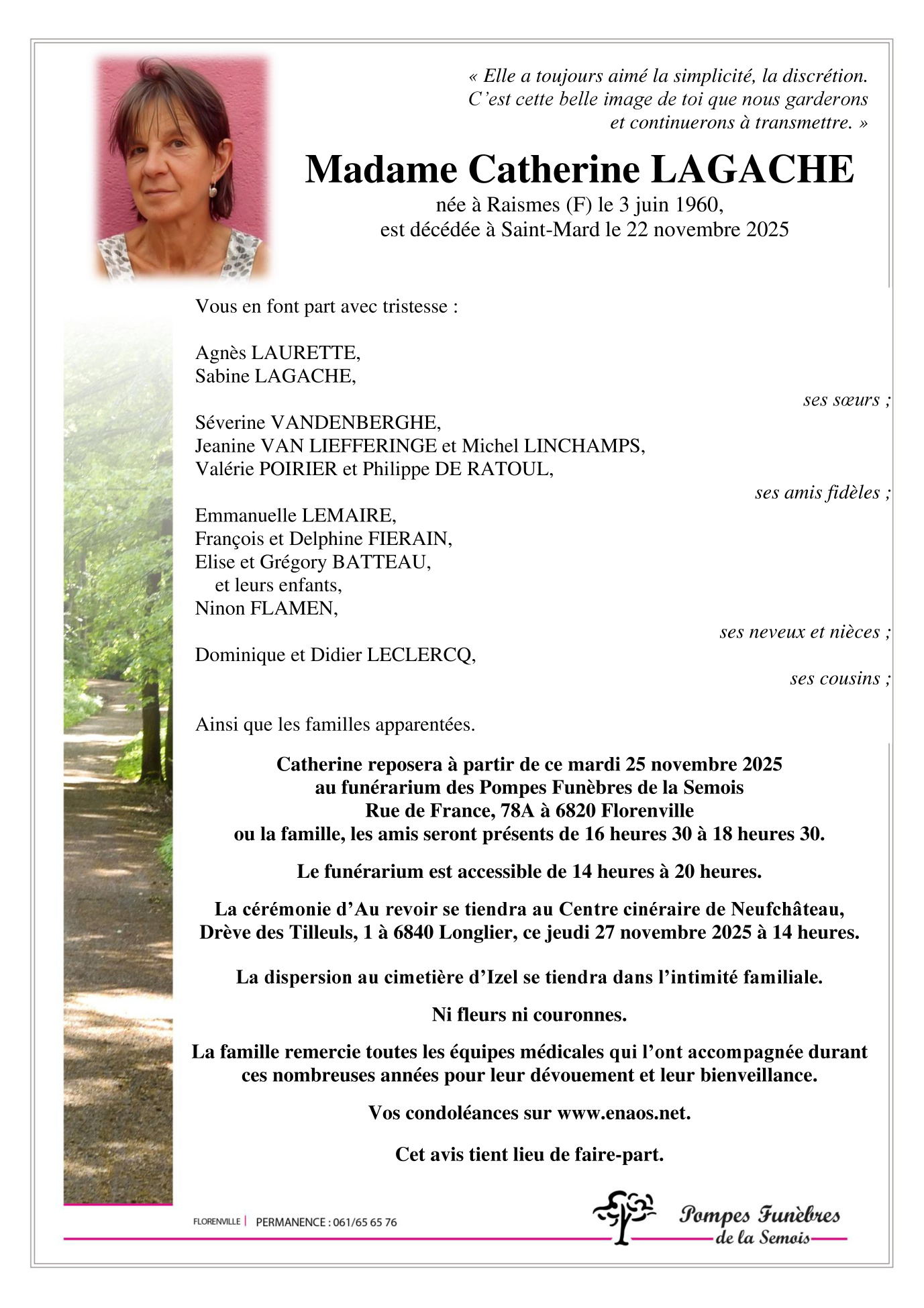 Décédée à Saint-Mard (6762) le samedi 22 novembre 2025 à l'âge de 65 ans