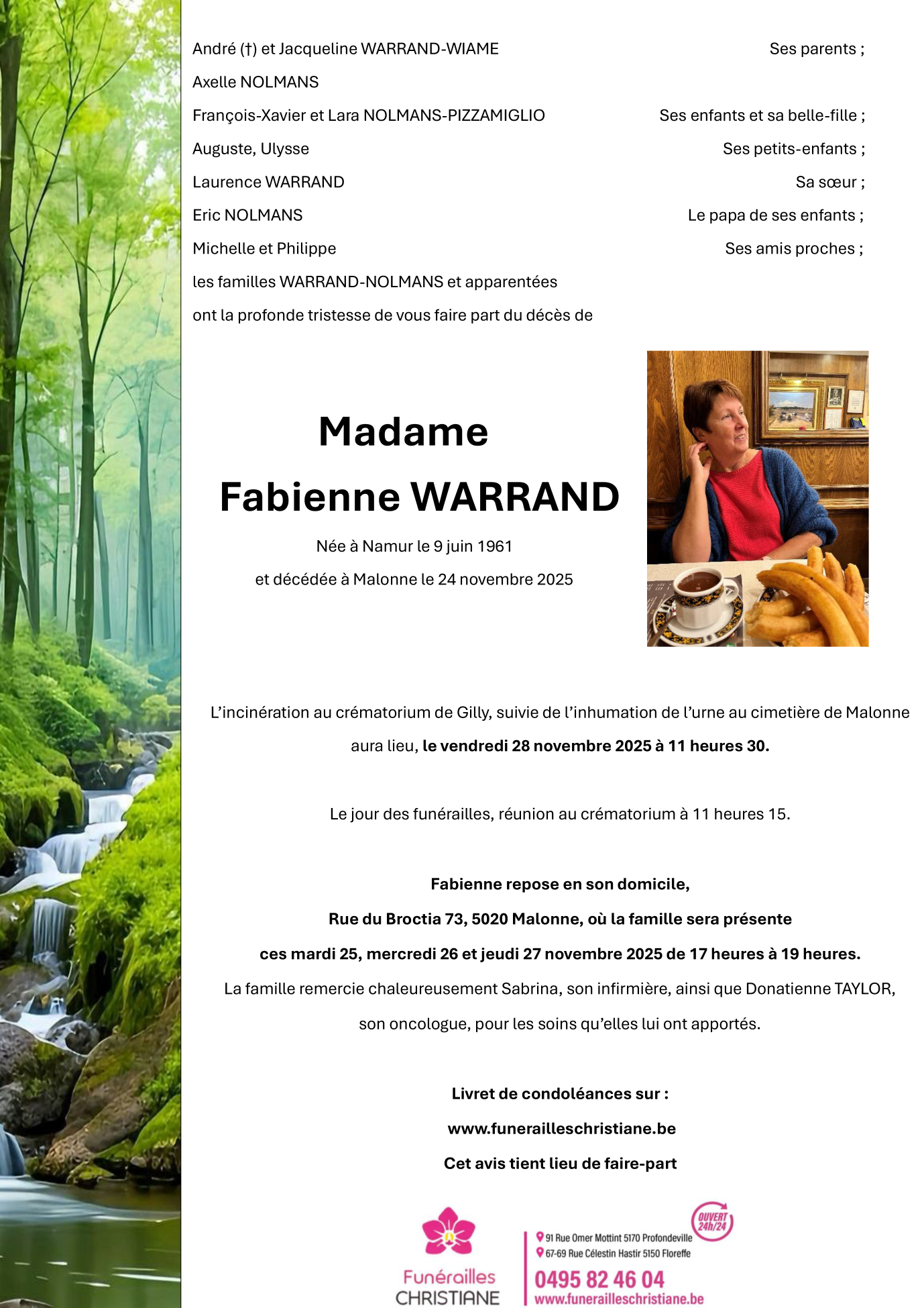 Décédée à Malonne (5020) le lundi 24 novembre 2025 à l'âge de 64 ans
