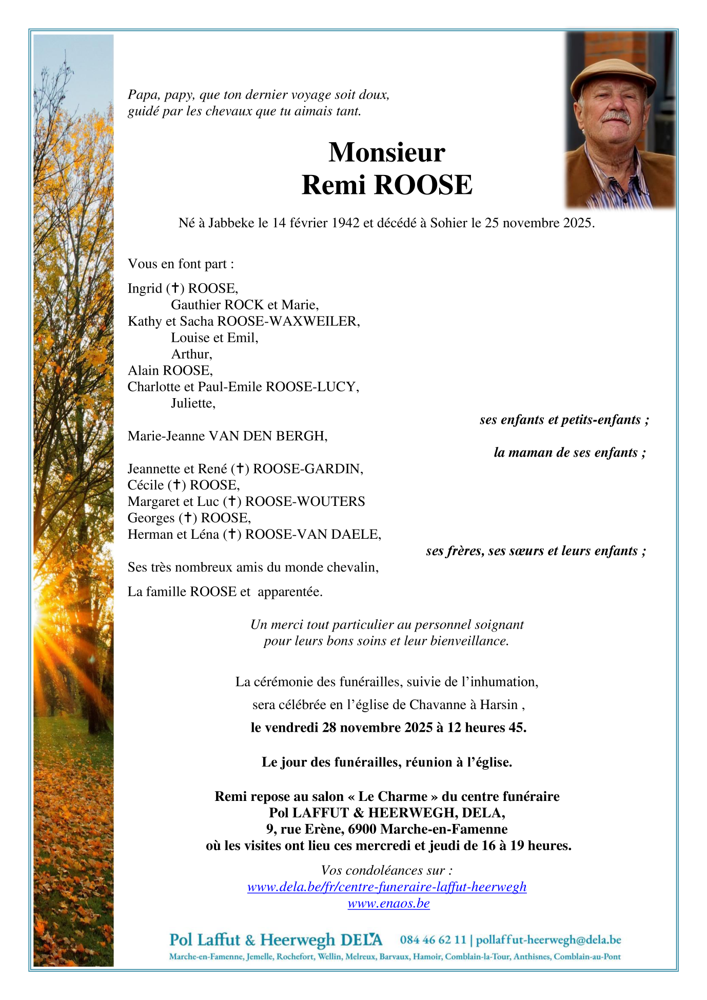 Décédé à Sohier (6920) le mardi 25 novembre 2025 à l'âge de 83 ans