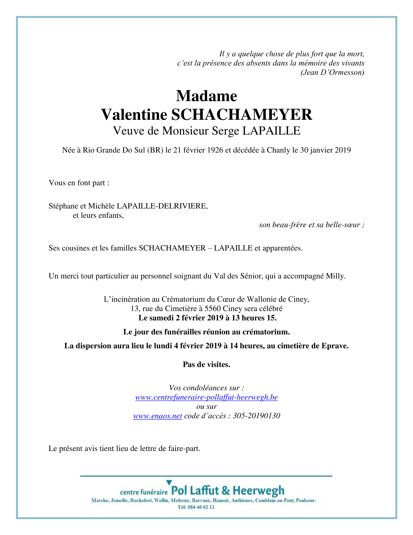 Décédée à Chanly (6921) le mercredi 30 janvier 2019 à l'âge de 92 ans