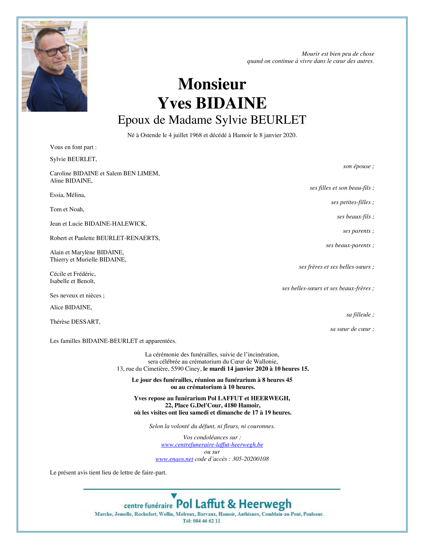 Décédé à Hamoir (4180) le mercredi 8 janvier 2020 à l'âge de 51 ans
