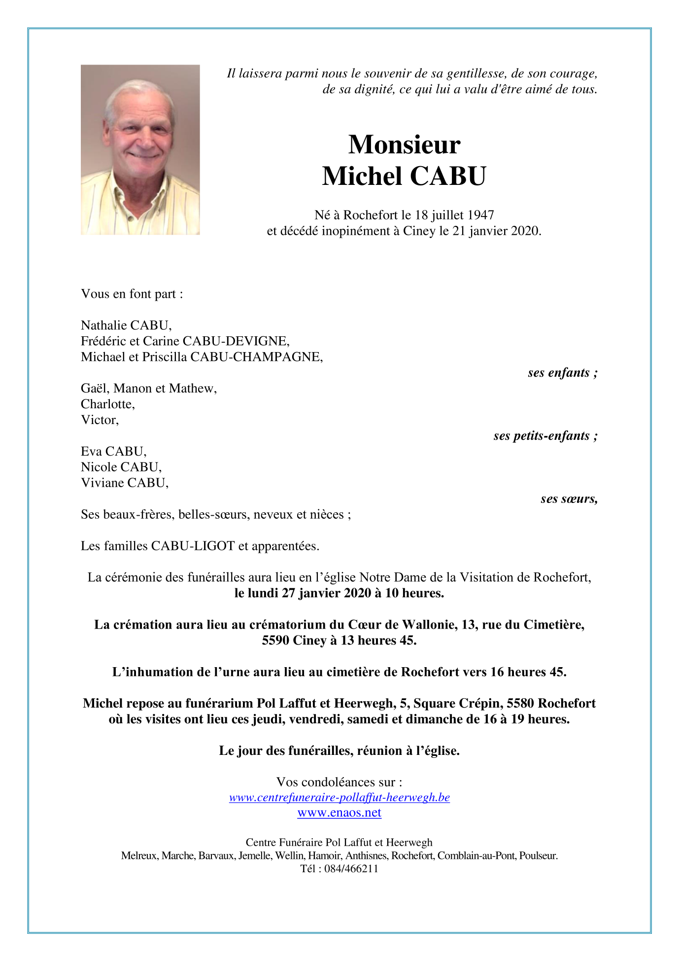 Décédé à Ciney (5590) le mardi 21 janvier 2020 à l'âge de 72 ans