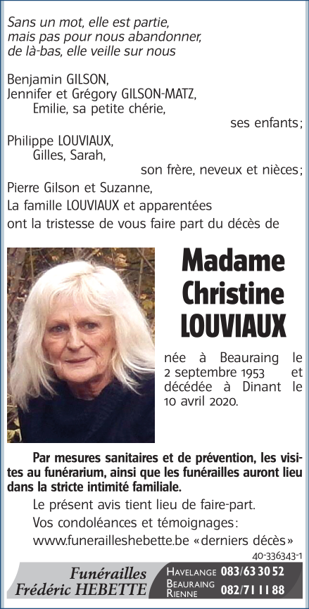 Fallecida en Dinant (5500) el viernes, 10 de abril de 2020 a la edad de 66 años