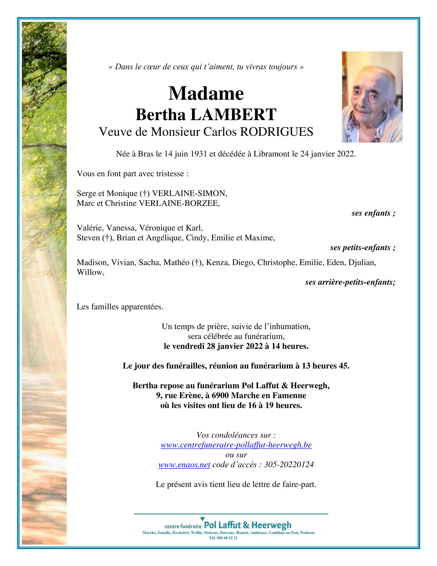 Décédée à Libramont (6800) le lundi 24 janvier 2022 à l'âge de 90 ans