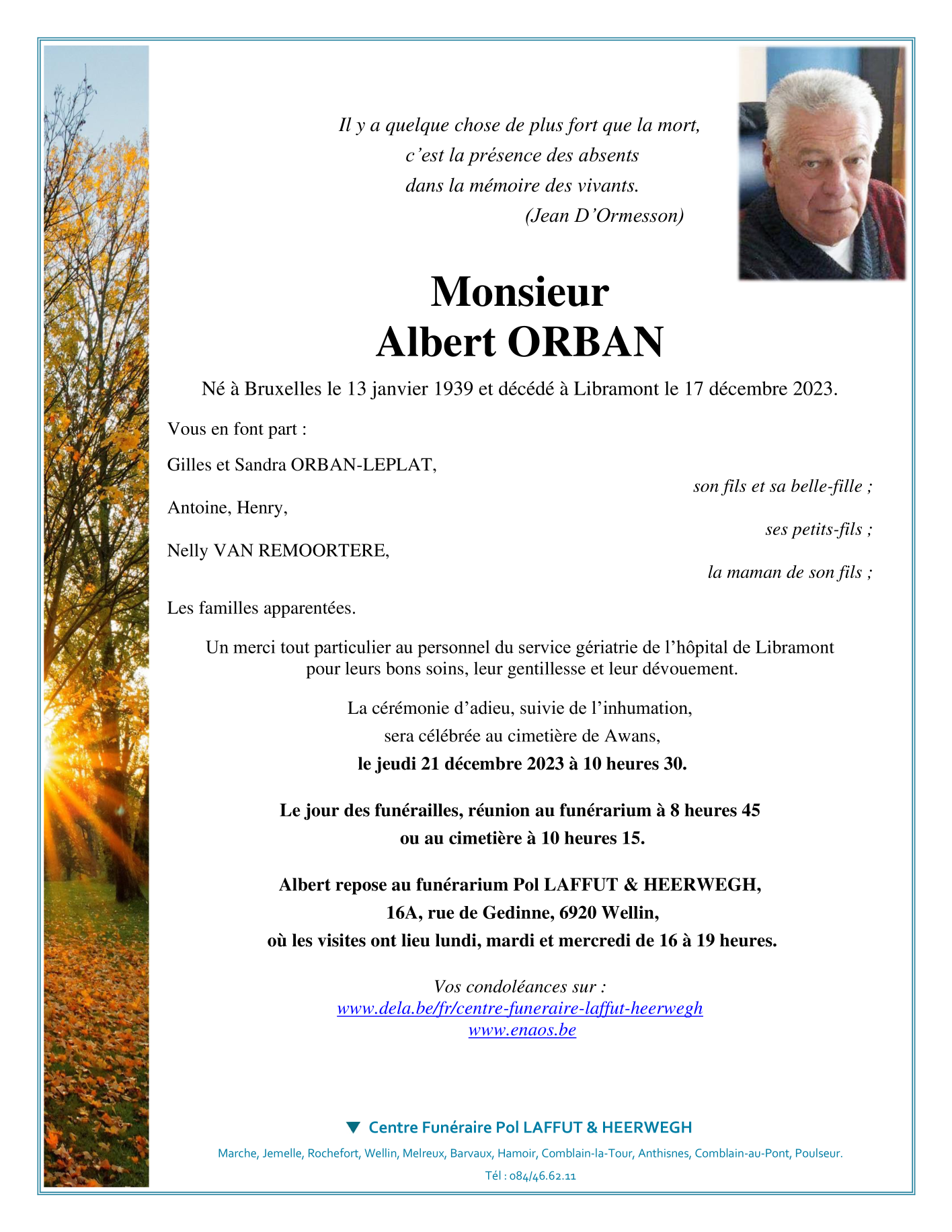 Died in Libramont (6800) on 17 December 2023 at the age of 84 years