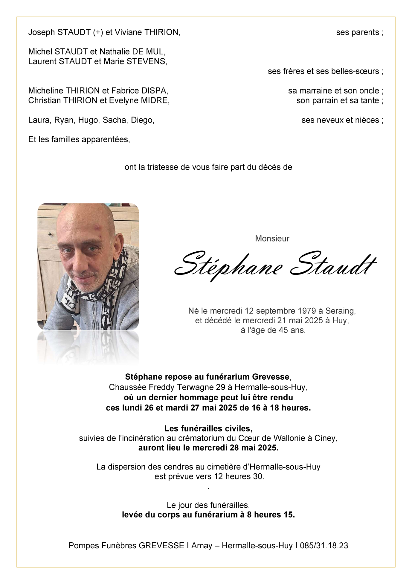 Décédé à Huy (4500) le mercredi 21 mai 2025 à l'âge de 45 ans