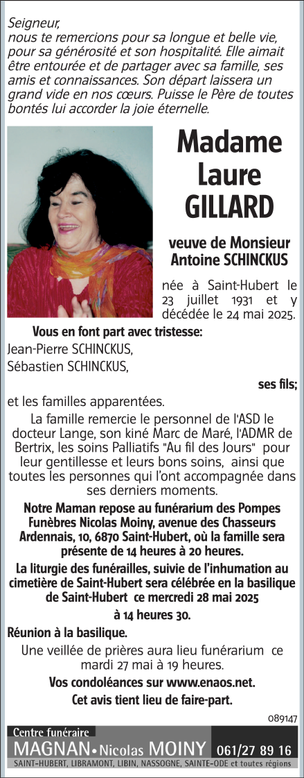 Overleden te Saint-Hubert (6870) op zaterdag 24 mei 2025 op 93-jarige leeftijd