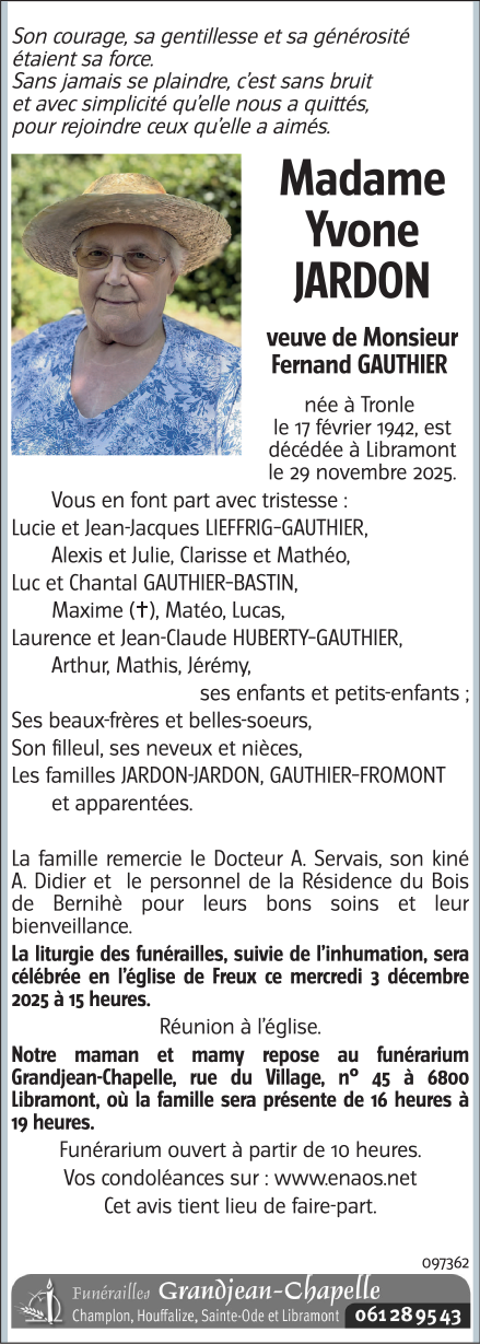 Died in Libramont (6800) on 29 November 2025 at the age of 83 years