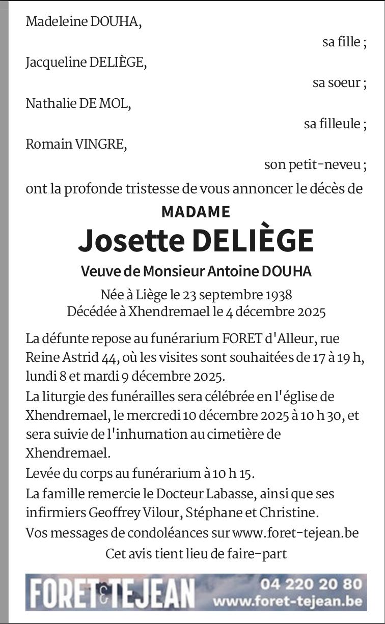 Décédée à Xhendremael (4432) le jeudi 4 décembre 2025 à l'âge de 87 ans