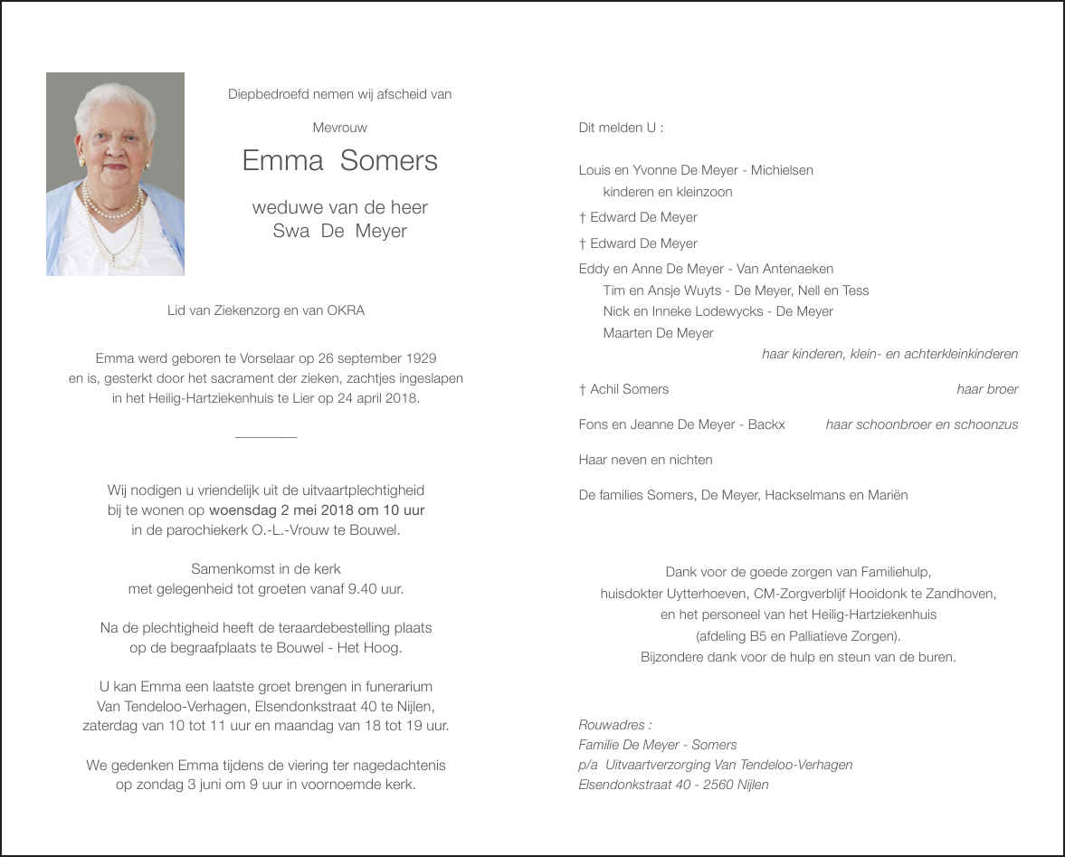 Décédée à Lier (2500) le mardi 24 avril 2018 à l'âge de 88 ans
