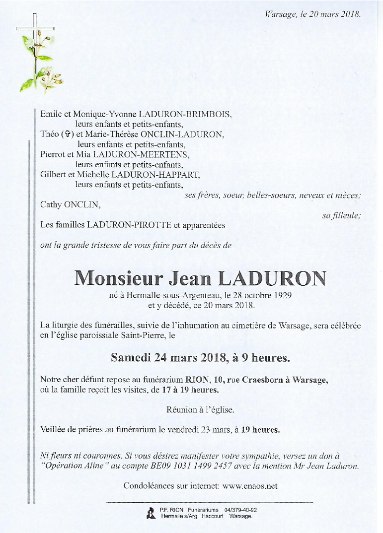Décédé à Hermalle-sous-Argenteau (4681) le mardi 20 mars 2018 à l'âge de 88 ans