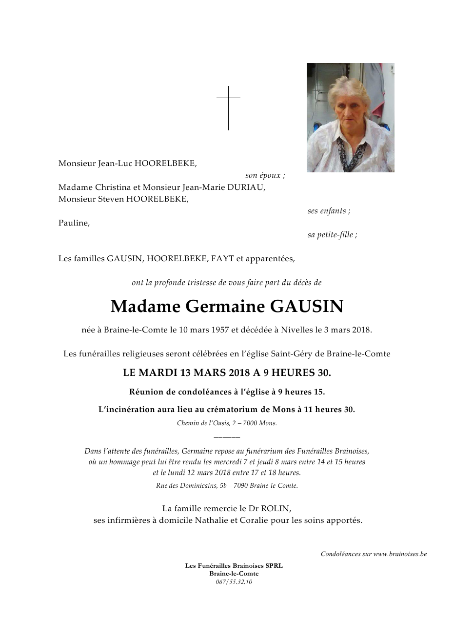 Fallecida en Nivelles (1400) el sábado, 3 de marzo de 2018 a la edad de 60 años