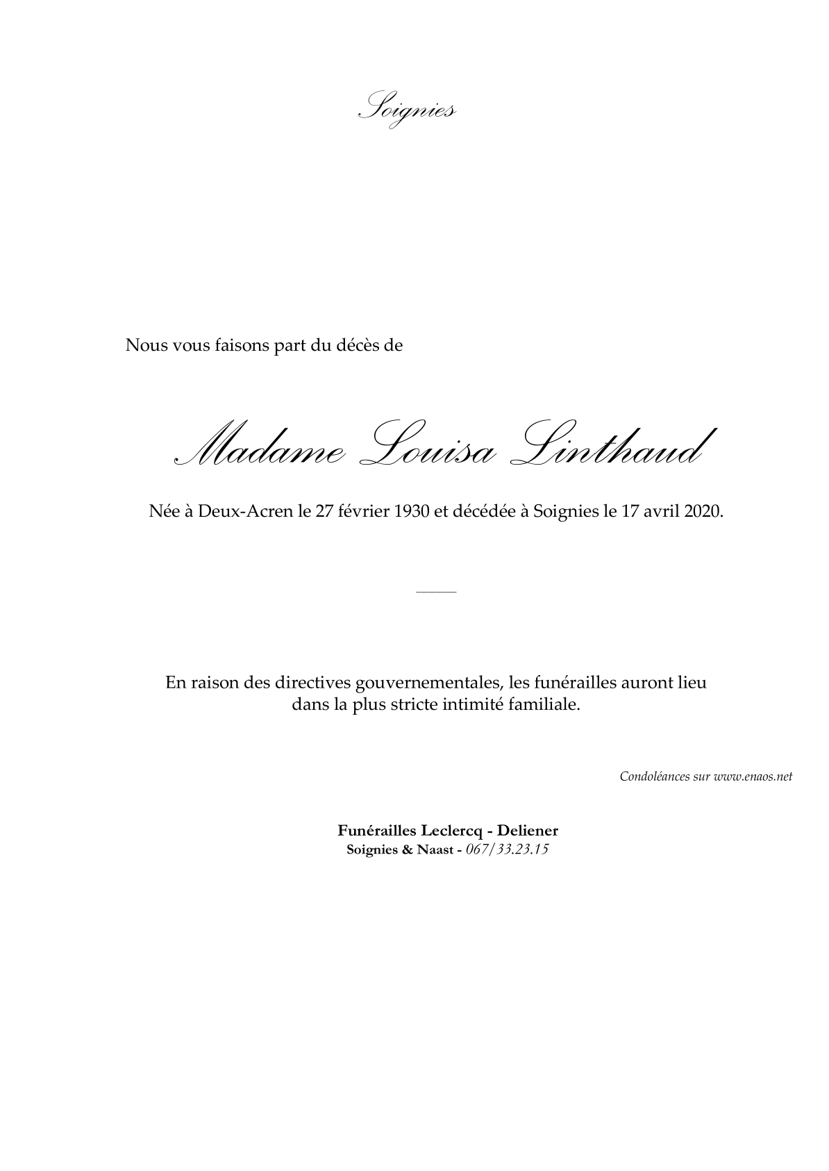 Died in Soignies (7060) on 17 April 2020 at the age of 90 years