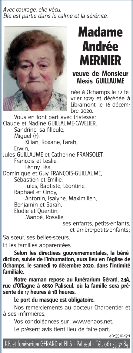 Décédée à Libramont (6800) le mercredi 16 décembre 2020 à l'âge de 91 ans