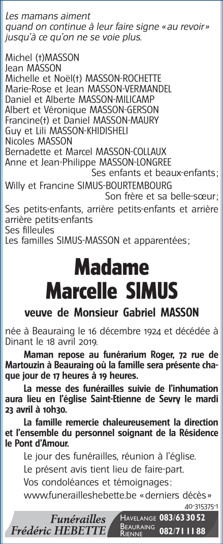Overleden te Dinant (5500) op donderdag 18 april 2019 op 94-jarige leeftijd