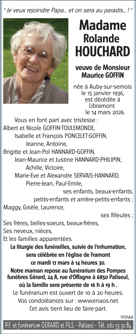 Décédée à Libramont (6800) le samedi 14 mars 2026 à l'âge de 90 ans