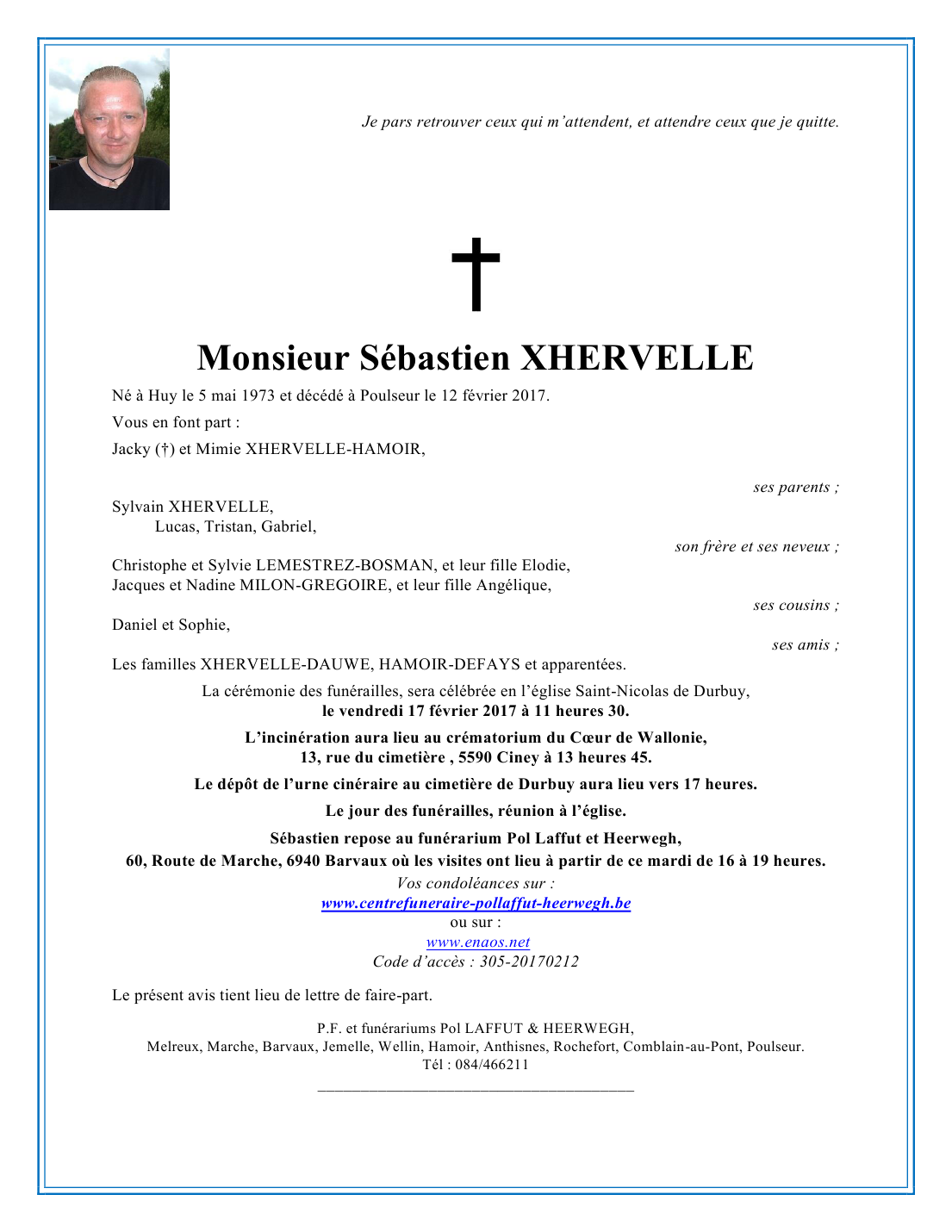 Décédé à Poulseur (4171) le dimanche 12 février 2017 à l'âge de 43 ans