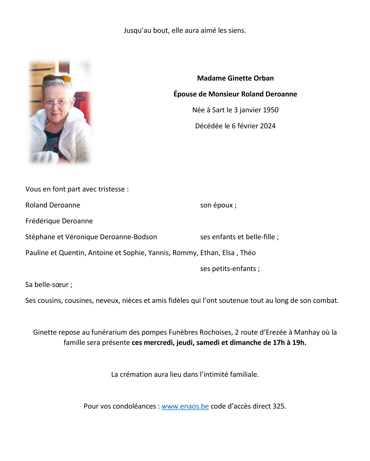 Décédée à Lierneux (4990) le mardi 6 février 2024 à l'âge de 74 ans
