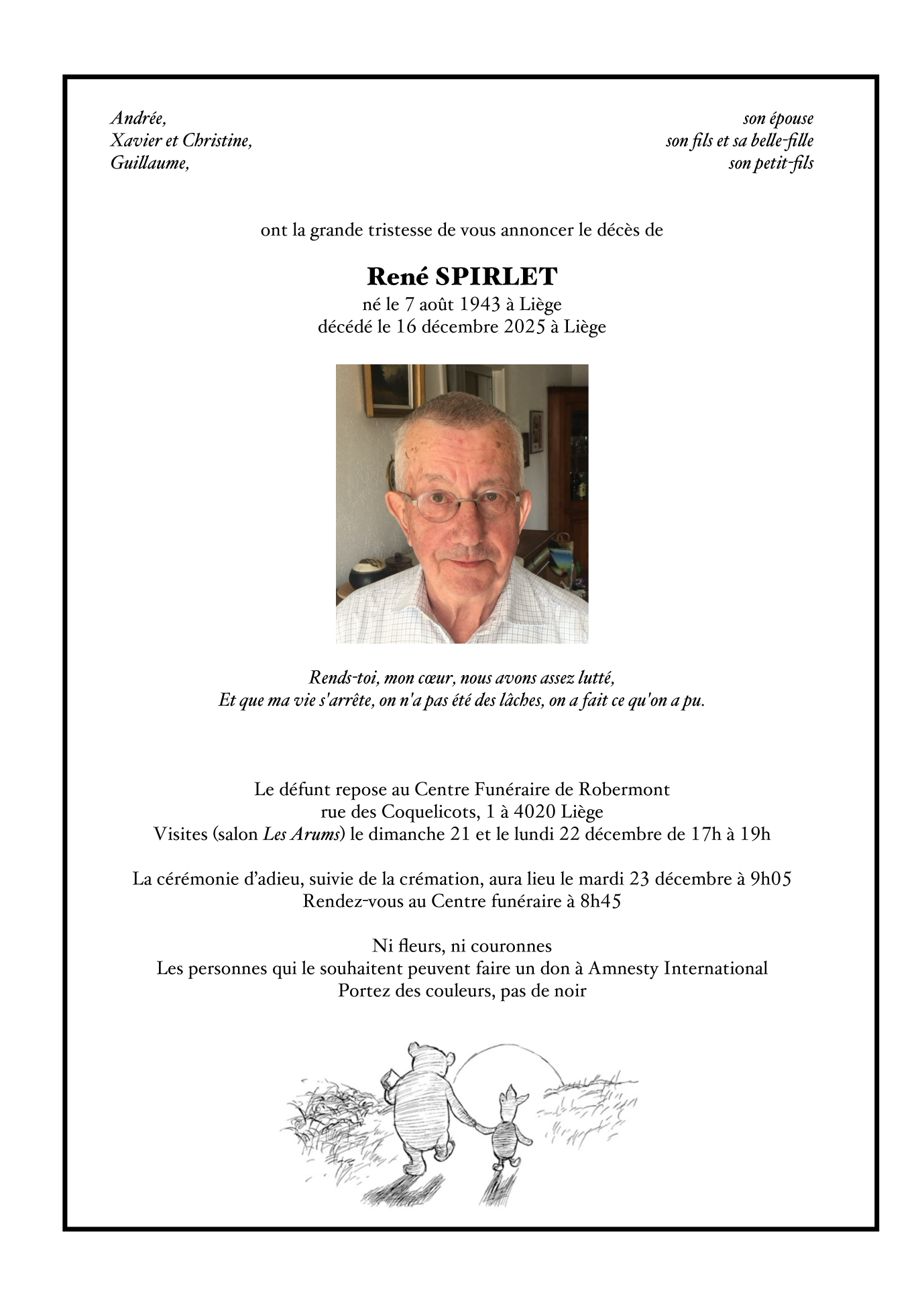 Died in Liège (4000) on 16 December 2025 at the age of 82 years