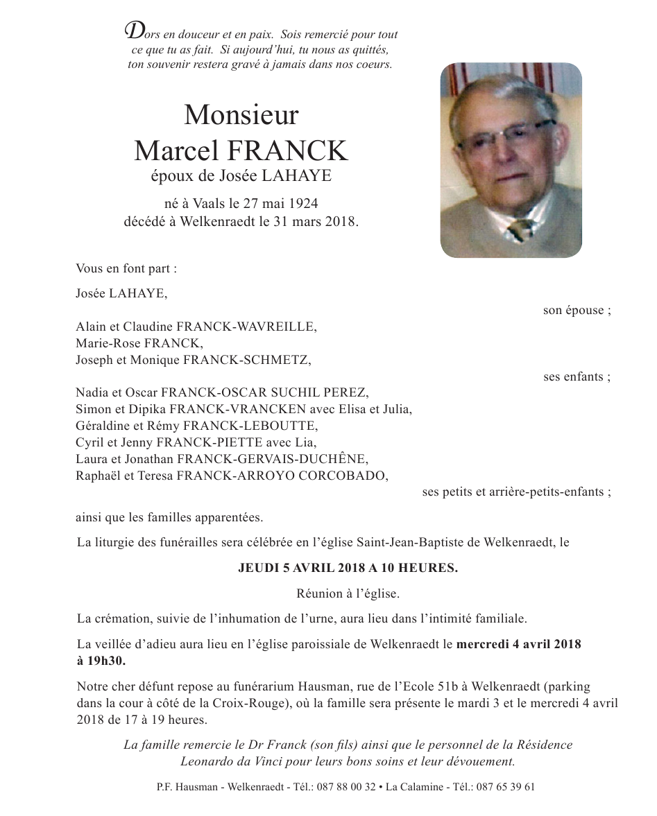 Décédé à Welkenraedt (4840) le samedi 31 mars 2018 à l'âge de 93 ans