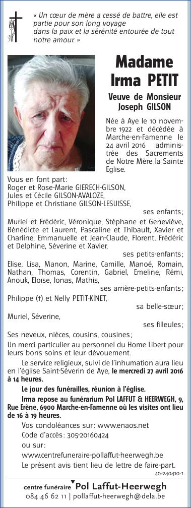 Fallecida en Marche-en-Famenne (6900) el domingo, 24 de abril de 2016 a la edad de 93 años