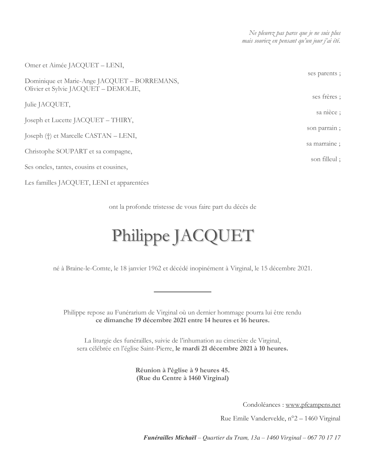 Décédé à Virginal-Samme (1460) le mercredi 15 décembre 2021 à l'âge de 59 ans