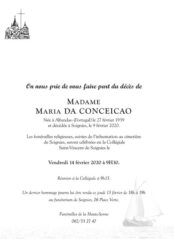 Décédée à Soignies (7060) le dimanche 9 février 2020 à l'âge de 80 ans