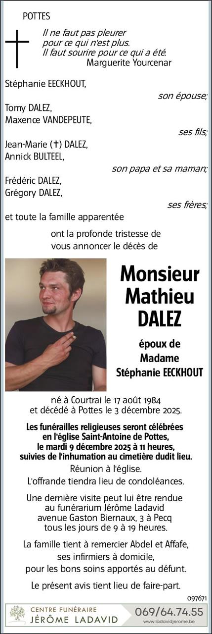 Décédé à Pottes (7760) le mercredi 3 décembre 2025 à l'âge de 41 ans