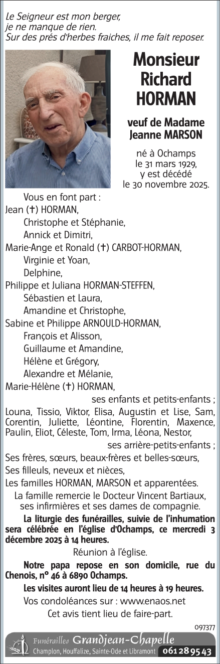 Décédé à Ochamps (6890) le dimanche 30 novembre 2025 à l'âge de 96 ans