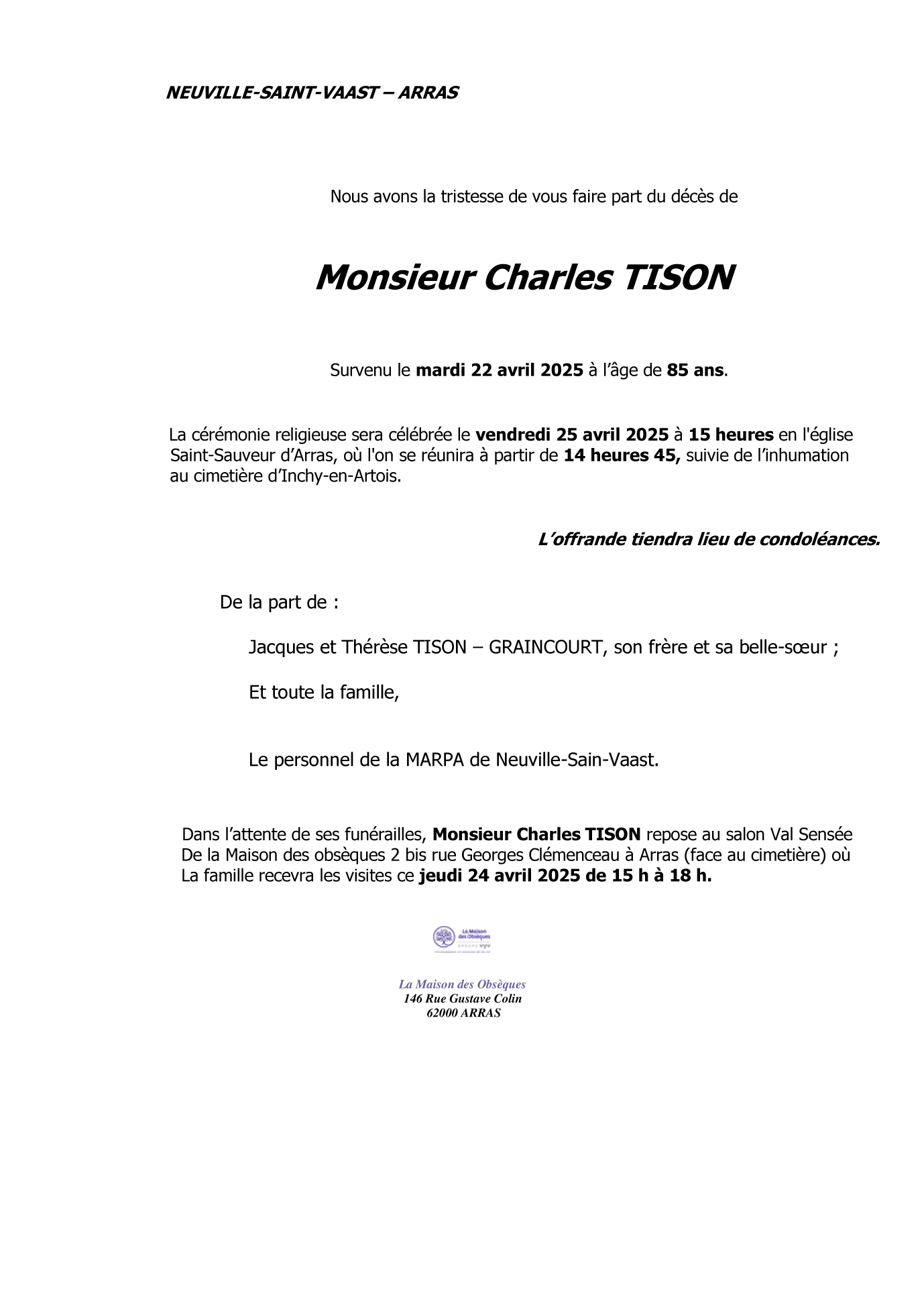 Décédé à Neuville-Saint-Vaast (62580, France) le mardi 22 avril 2025 à l'âge de 85 ans