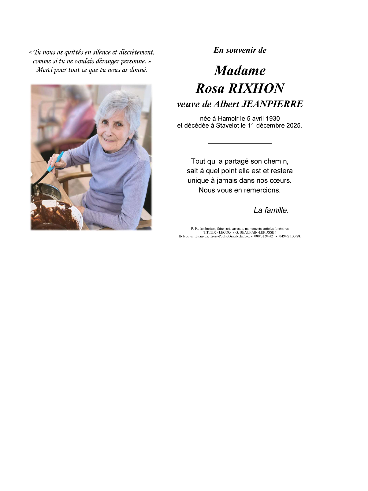 Décédée à Stavelot (4970) le jeudi 11 décembre 2025 à l'âge de 95 ans